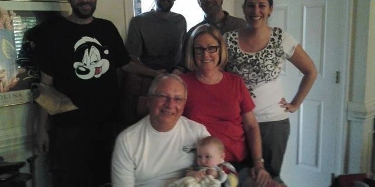 In front is Jeff holding his new grandson - Sam - "Sam I am" as Jeff affectionately calls him. Behind Jeff is new Grandma, Martha. In the back, left to right are Jeff's kids - Scott, Matt, Sam's dad Jay, and daughter Taylor...