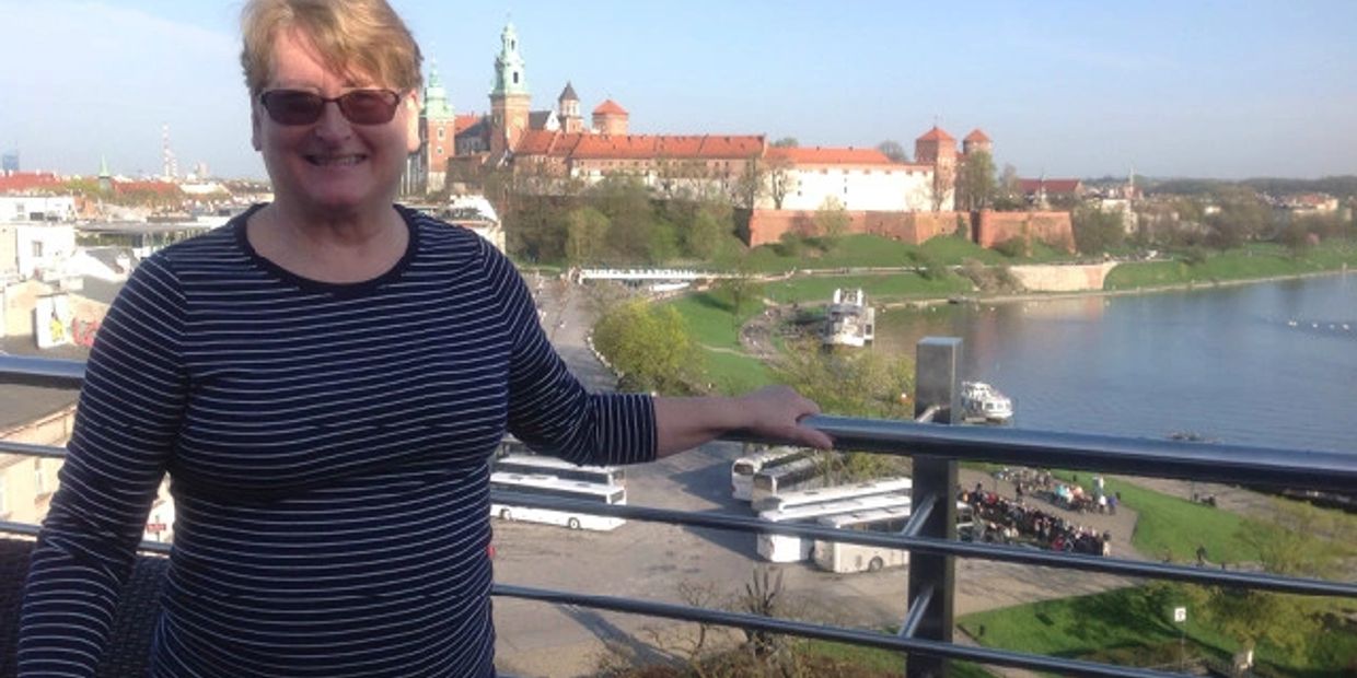 This is Caroline Purnell Tompkins in front of the Wewal Castle in Krakow, Poland. She and husband Tom also visited Auschitz and Birknau as part of a 2 month trip to Poland, The Baltics, Russia, Korea and Japan.